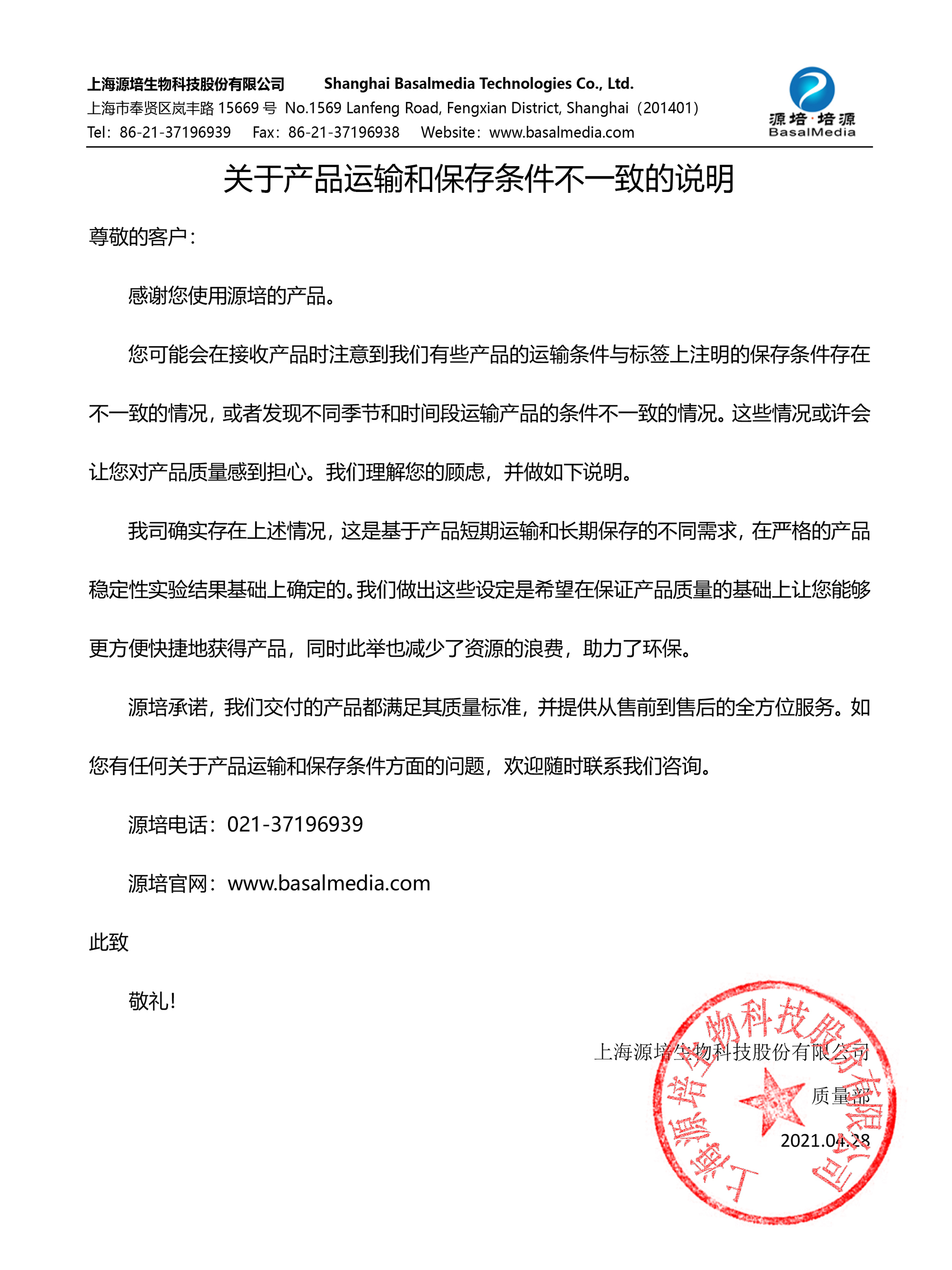 關于產(chǎn)品運輸和保存條件不一致的說明