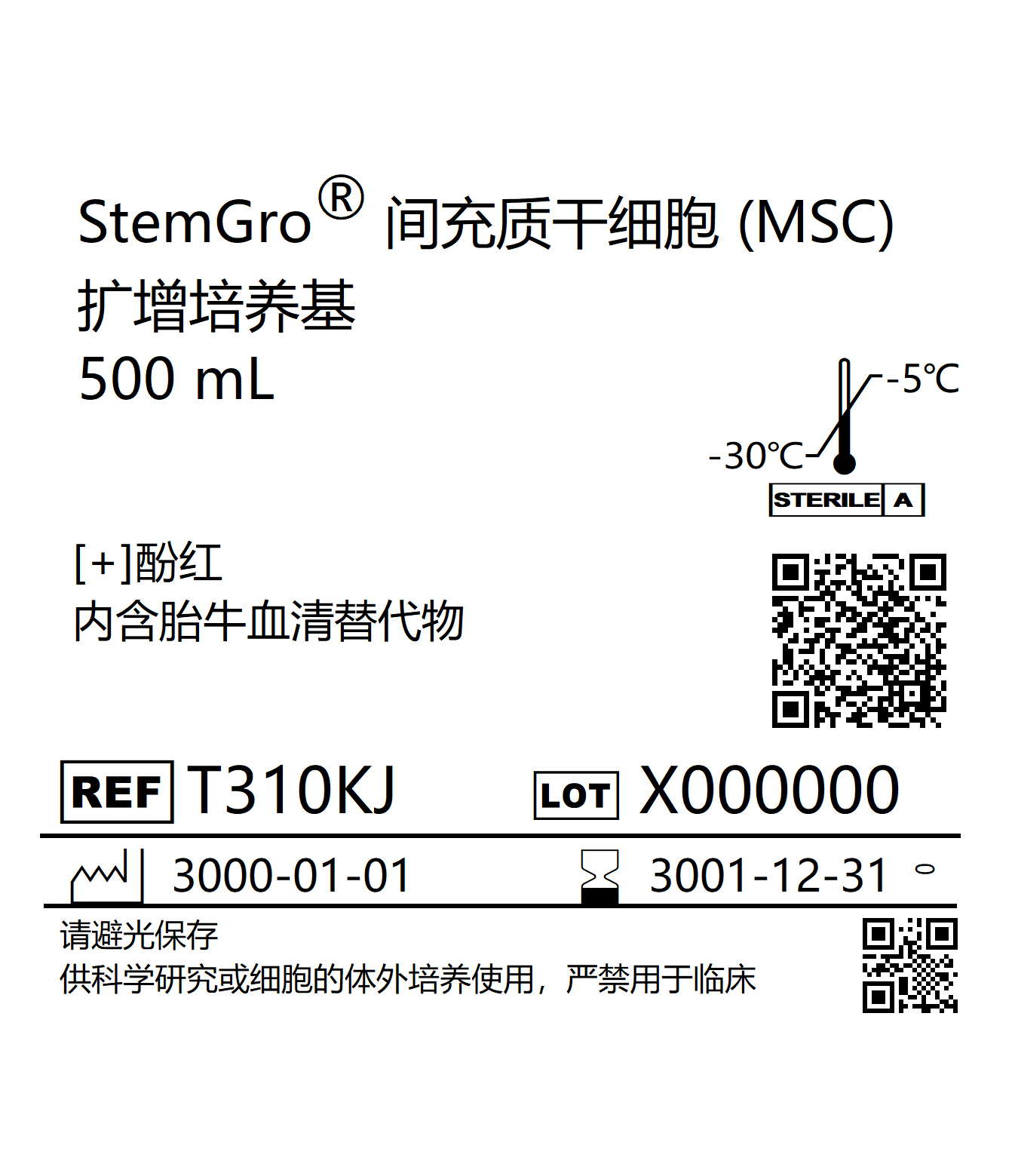 StemGro? 間充質(zhì)干細(xì)胞(MSC)擴(kuò)增培養(yǎng)基是專為人類間充質(zhì)干細(xì)胞(包括臍帶間充質(zhì)、骨髓間充質(zhì)、脂肪間充質(zhì)、臍帶血間充質(zhì)等干細(xì)胞)設(shè)計(jì)的無異源物質(zhì)(Xeno-free)培養(yǎng)基。在干細(xì)胞分離過程中,當(dāng)細(xì)胞貼壁率達(dá)到 75 ~85 % 后,可使用此培養(yǎng)基進(jìn)行傳代。與傳統(tǒng)的須添加動物血清的培養(yǎng)基相比,StemGro?間充質(zhì)干細(xì)胞(MSC)培養(yǎng)基能維持間充質(zhì)干細(xì)胞的無分化生長, 保持細(xì)胞的形態(tài)特征和正常的染色體核型等, 保證間充質(zhì)干細(xì)胞的高增殖率以及分化潛能,并排除了培養(yǎng)過程中混入異源物質(zhì)(來自于人類以外的其他動物物種的成分)的可能性。