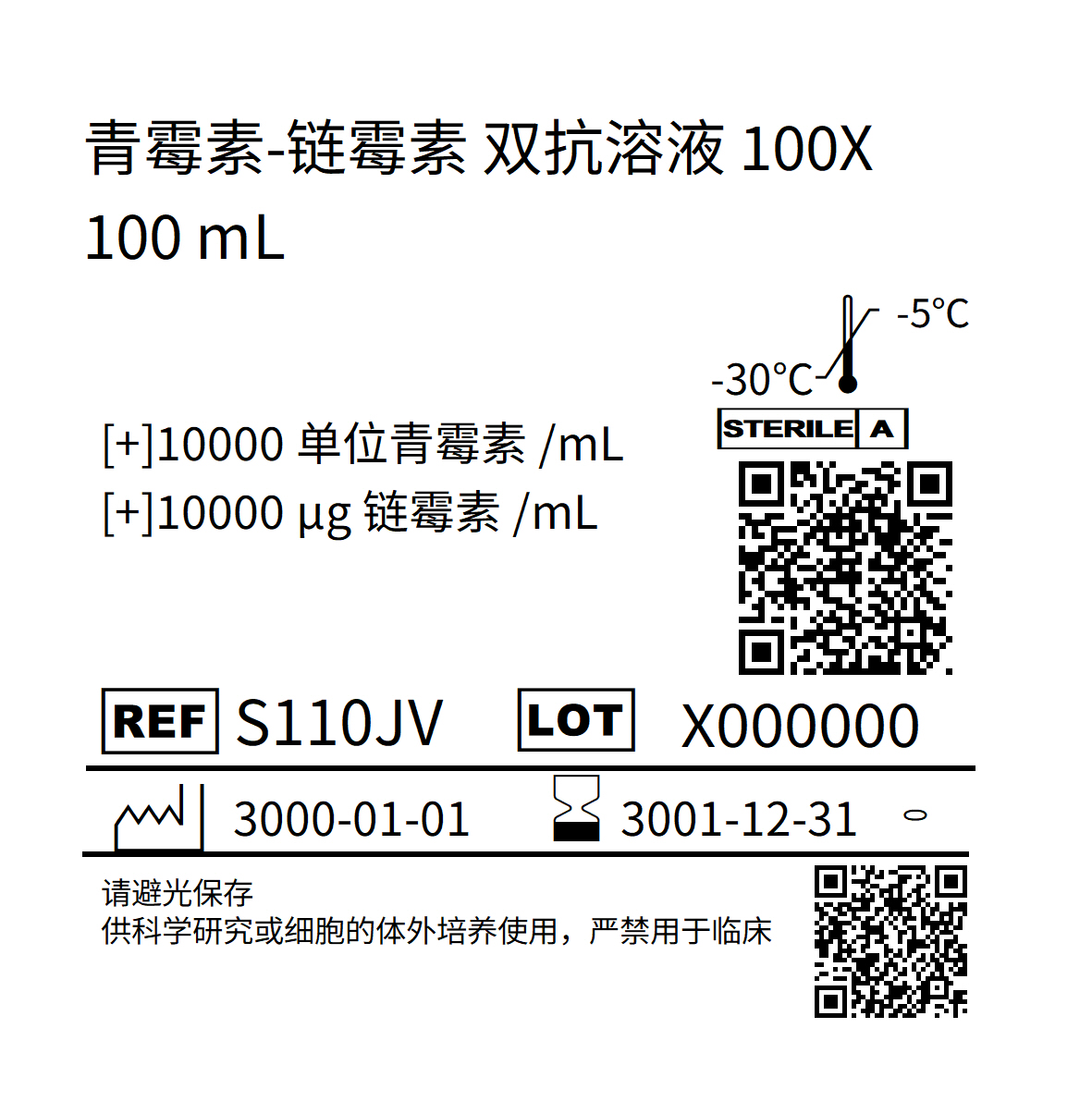 青霉素-鏈霉素溶液,通稱“雙抗”,為青霉素G鈉鹽和硫酸鏈霉素溶解在0.85% NaCl溶液中,每毫升溶液含10,000單位青霉素和10,000μg鏈霉素。