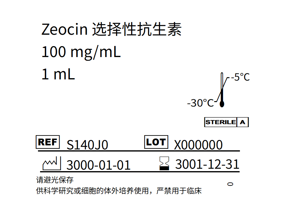 Zeocin?是博來霉素家族的一員,能插入并裂解DNA,致使細(xì)胞死亡。Sh ble基因編碼一個(gè)13665道爾頓的蛋白,使細(xì)胞獲得 Zeocin?抗性。這個(gè)蛋白能結(jié)合在抗生素上,并阻止其與DNA結(jié)合,因而獲得Zeocin?抗性。Zeocin?對大多數(shù)需氧細(xì)胞都有作用,可以用于哺乳動(dòng)物細(xì)胞系、酵母和細(xì)菌的篩選。每種細(xì)胞類型篩選所需的Zeocin?的量都是不同的。