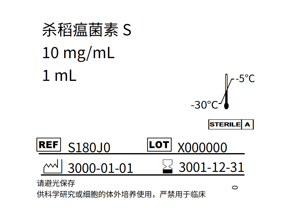 殺稻瘟菌素S用于預防細胞培養(yǎng)的污染。推薦的工作濃度范圍為1–20 μg/mL,取決于細胞的種類。