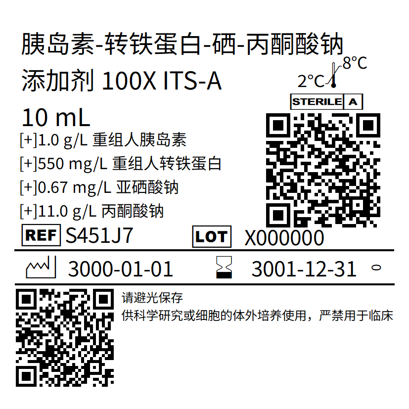 | 重要組分(+) | [+]1.0 g/L 重組人胰島素[+]550 mg/L 重組人轉(zhuǎn)鐵蛋白[+]0.67 mg/L 亞硒酸鈉[+]11.0 g/L 丙酮酸鈉 |