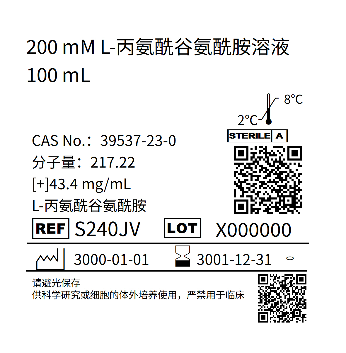 L-丙胺酰谷氨酰胺在室溫下是穩(wěn)定的。在室溫、2 - 8°C, 或 -5 - -20°C都可以保持成分穩(wěn)定長達(dá)24個月以上,便于儲存與運(yùn)輸。即使在37°C,也可穩(wěn)定一星期甚至更長時間。