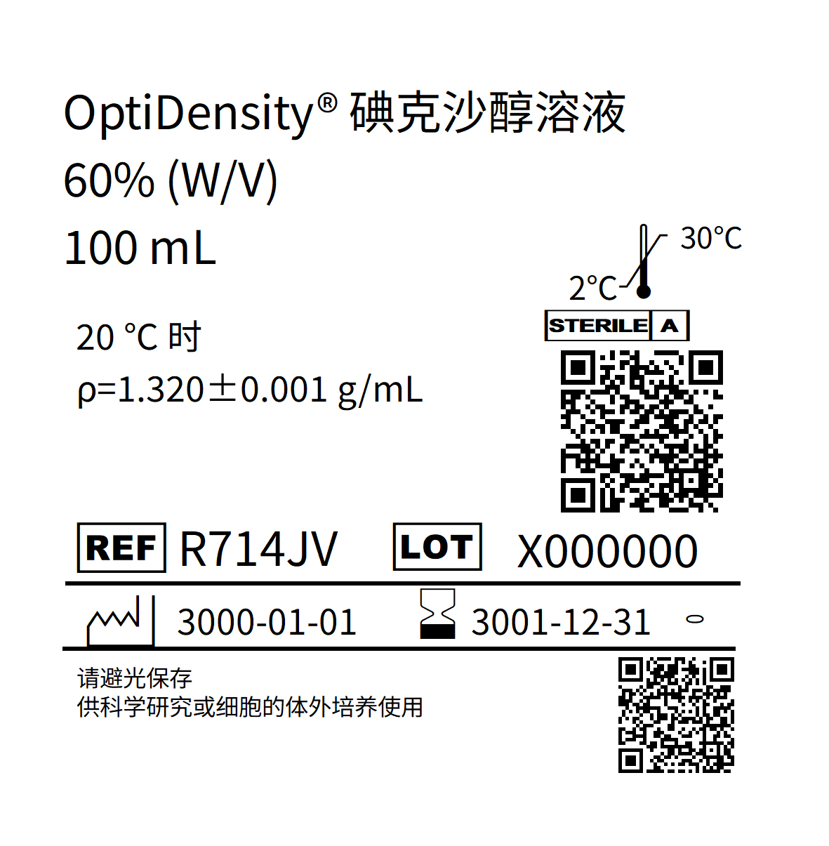 本產(chǎn)品為碘克沙醇(Iodixanol)水溶液,濃度為60%(W/V),在此濃度下的密度為1.320g/mL。碘克沙醇是非離子型化合物,細胞毒性低,分子量1550Da,有高親水側(cè)鏈,水中的溶解度可達 80 %(W/V),在此濃度下的密度為1.426 g/mL。同時還能溶解在甲酰胺、二甲基甲酰胺和乙醇中,溶解度可達50 %(W/V)。使用無水介質(zhì)可以減少生物學(xué)微粒比如線粒體和細胞核中水溶成分的流失。當用于人淋巴細胞分離時,可直接選購已經(jīng)配置好相應(yīng)密度(ρ=1.077g/mL)的淋巴細胞分離液,貨號:R710JV。在ρ1.077樣本密度分離液的基礎(chǔ)上,通過加入一定體積的碘克沙醇溶液或PBS稀釋液進行配比,可以得到不同密度的樣本分離液,以下列出了部分常用密度的配置體積比:
