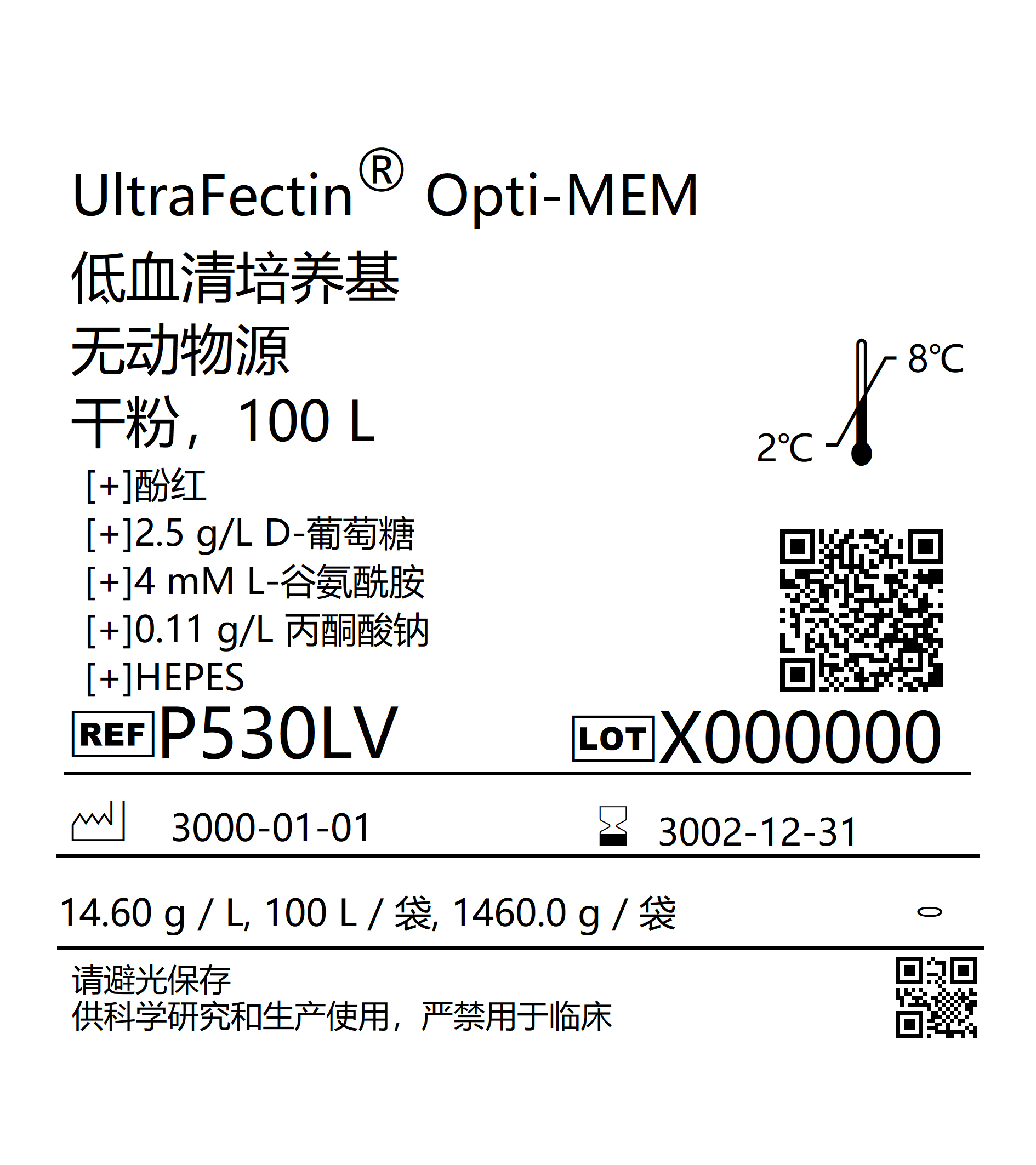 UltraFectin® Opti-MEM低血清培養(yǎng)基,是一種經(jīng)MEM改良而來(lái)的培養(yǎng)基,不含無(wú)動(dòng)物源成分,廣泛適用于多種貼壁和懸浮哺乳動(dòng)物細(xì)胞的培養(yǎng)。該培養(yǎng)基含有重組胰島素、重組轉(zhuǎn)鐵蛋白、次黃嘌呤、胸苷和微量元素,這些附加組分可有效降低血清用量,能夠使胎牛血清的添加量減少至少50%。