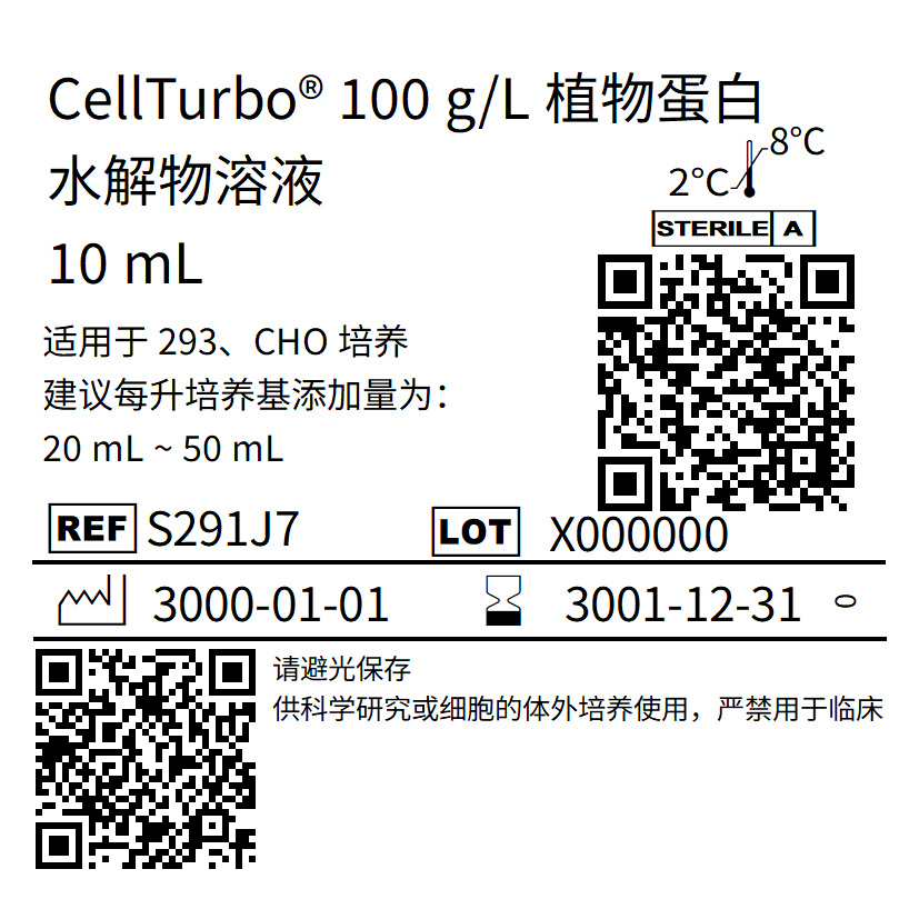 CellTurbo? 100g/L 植物蛋白水解物是通過對(duì)植物源性原材料進(jìn)行新的分解方法和加工處理方式制備而來的。該方法可以生產(chǎn)高品質(zhì)的水解物,同時(shí)提高批間穩(wěn)定性和水解物在真核生物制藥生產(chǎn)體系中的性能。采用植物源蛋白水解物與其他添加物相組合的方式已被驗(yàn)證可提高生物制藥平臺(tái)的整體性能,這些添加劑包括胰島素,轉(zhuǎn)鐵蛋白以及來自血清或其他動(dòng)物來源的白蛋白等生長(zhǎng)因子。植物蛋白水解物溶液不含動(dòng)物源成分,不含蛋白質(zhì),適用于293細(xì)胞和CHO細(xì)胞的高密度懸浮培養(yǎng),可提高各種生物制藥生產(chǎn)系統(tǒng)的整體性能,如改善細(xì)胞活力、細(xì)胞增殖和靶蛋白等生產(chǎn)能力。