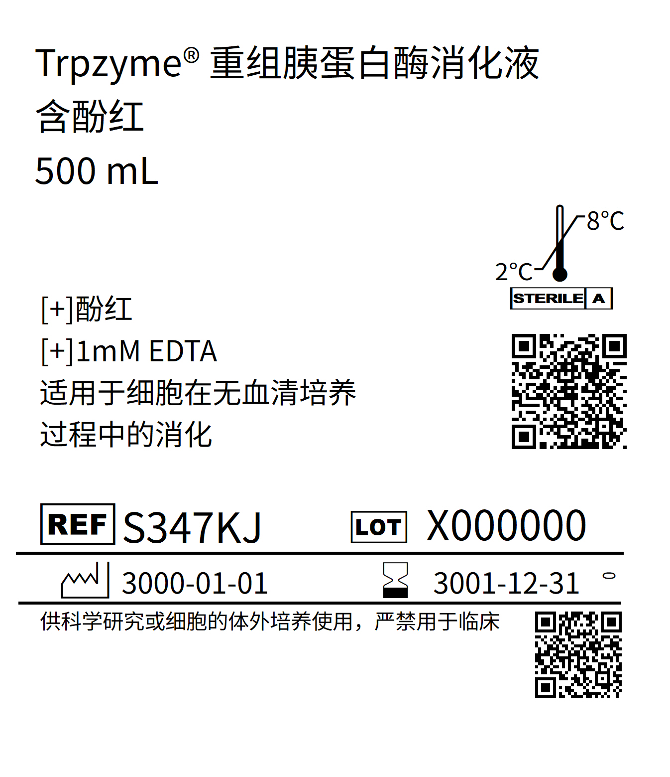 本品采用微生物發(fā)酵表達(dá)而獲得的高純度、高比活重組胰蛋白酶作為主要原料,通過無菌過濾配制而成的細(xì)胞消化液,產(chǎn)品中不使用任何含動(dòng)物源的原料,產(chǎn)品受外源病毒污染的風(fēng)險(xiǎn)極低,具有極高的生物安全性,可完全代替豬源或牛源胰蛋白酶(Trypsin)在生物工程各個(gè)領(lǐng)域中的應(yīng)用,特別是重組蛋白、疫苗制品生產(chǎn)過程中的哺乳動(dòng)物細(xì)胞的消化,同時(shí)無需使用胰蛋白酶抑制劑來中和細(xì)胞消化后殘留在培養(yǎng)基里的微量酶活。由于本產(chǎn)品消化能力較溫和,因此建議用于低血清或者無血清環(huán)境下弱貼壁細(xì)胞以及干細(xì)胞在傳代過程中的消化,而不建議用于在含10%血清環(huán)境下生長的貼壁細(xì)胞的傳代消化。對于這類強(qiáng)貼壁細(xì)胞,建議使用源培提供的定制化重組胰酶產(chǎn)品(X342JV,X342KJ)