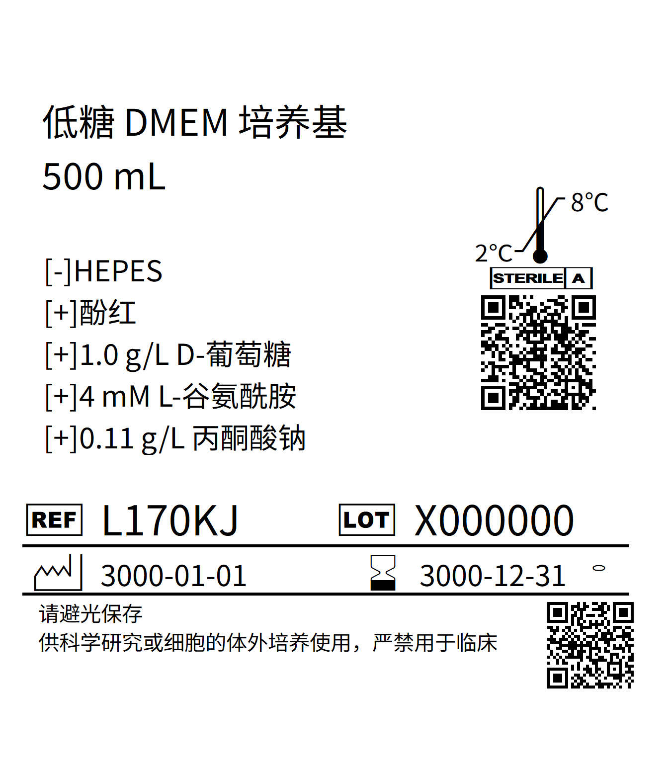 | 重要組分(+) | [+]酚紅[+]1.0 g/L D-葡萄糖[+]4 mM L-谷氨酰胺[+]0.11 g/L 丙酮酸鈉 |