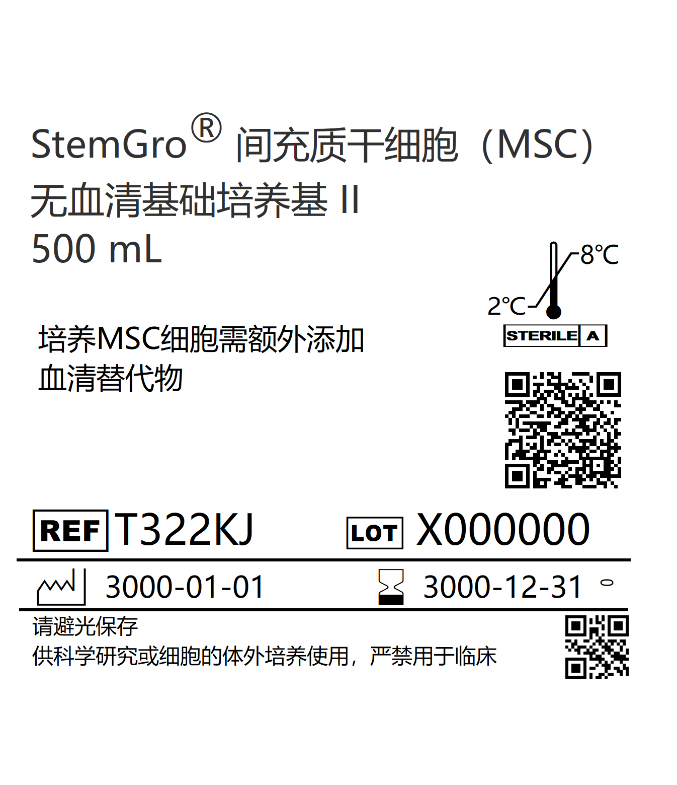 StemGro® 間充質(zhì)干細(xì)胞(MSC)無血清基礎(chǔ)培養(yǎng)基II是專為人類間充質(zhì)干細(xì)胞(包括臍帶間充質(zhì)、骨髓間充質(zhì)、脂肪間充質(zhì)、臍帶血間充質(zhì)等干細(xì)胞)設(shè)計(jì)的基礎(chǔ)培養(yǎng)基。該培養(yǎng)基為基礎(chǔ)配方,需添加一定比例的人血小板裂解物(PLT),制備成完全培養(yǎng)基后使用。在干細(xì)胞分離過程中,當(dāng)細(xì)胞貼壁率達(dá)到 75 ~85 % 后,可使用配置好的間充質(zhì)干細(xì)胞(MSC)無血清完全培養(yǎng)基進(jìn)行傳代。與傳統(tǒng)的須添加動(dòng)物血清的培養(yǎng)基相比,配合PLT使用的StemGro®間充質(zhì)干細(xì)胞(MSC)無血清基礎(chǔ)培養(yǎng)基能維持間充質(zhì)干細(xì)胞的無分化生長,保持細(xì)胞的形態(tài)特征和正常的染色體核型等,保證間充質(zhì)干細(xì)胞的高增殖率以及分化潛能,并排除了培養(yǎng)過程中混入異源物質(zhì)(來自于人類以外的其他動(dòng)物物種的成分)的可能性。