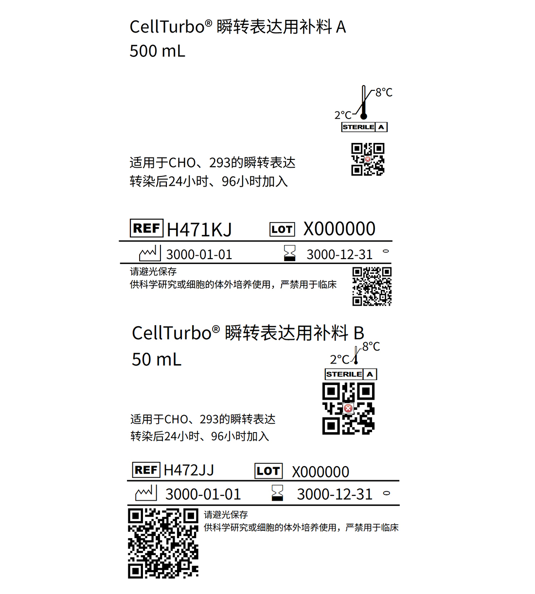 本產(chǎn)品是無動物來源、化學成分限定的補料,用于提高CHO細胞瞬轉后蛋白表達量。本產(chǎn)品含有高濃度的主要營養(yǎng)成份,是通過對細胞培養(yǎng)表現(xiàn)、物理特性、合規(guī)性和安全性進行多重分析而設計的補料,與CHOGrow®CD瞬轉培養(yǎng)基配套使用,進行流加補料批式培養(yǎng),對常見的CHO細胞系,如CHO-S, CHO-K1, DG44, GS等均適用。本產(chǎn)品由瞬轉補料A和瞬轉補料B兩部分組成,使用前請勿預先混合兩個組分,使用時直接將A、B組分按照所需比例分別直接加入到培養(yǎng)基中。