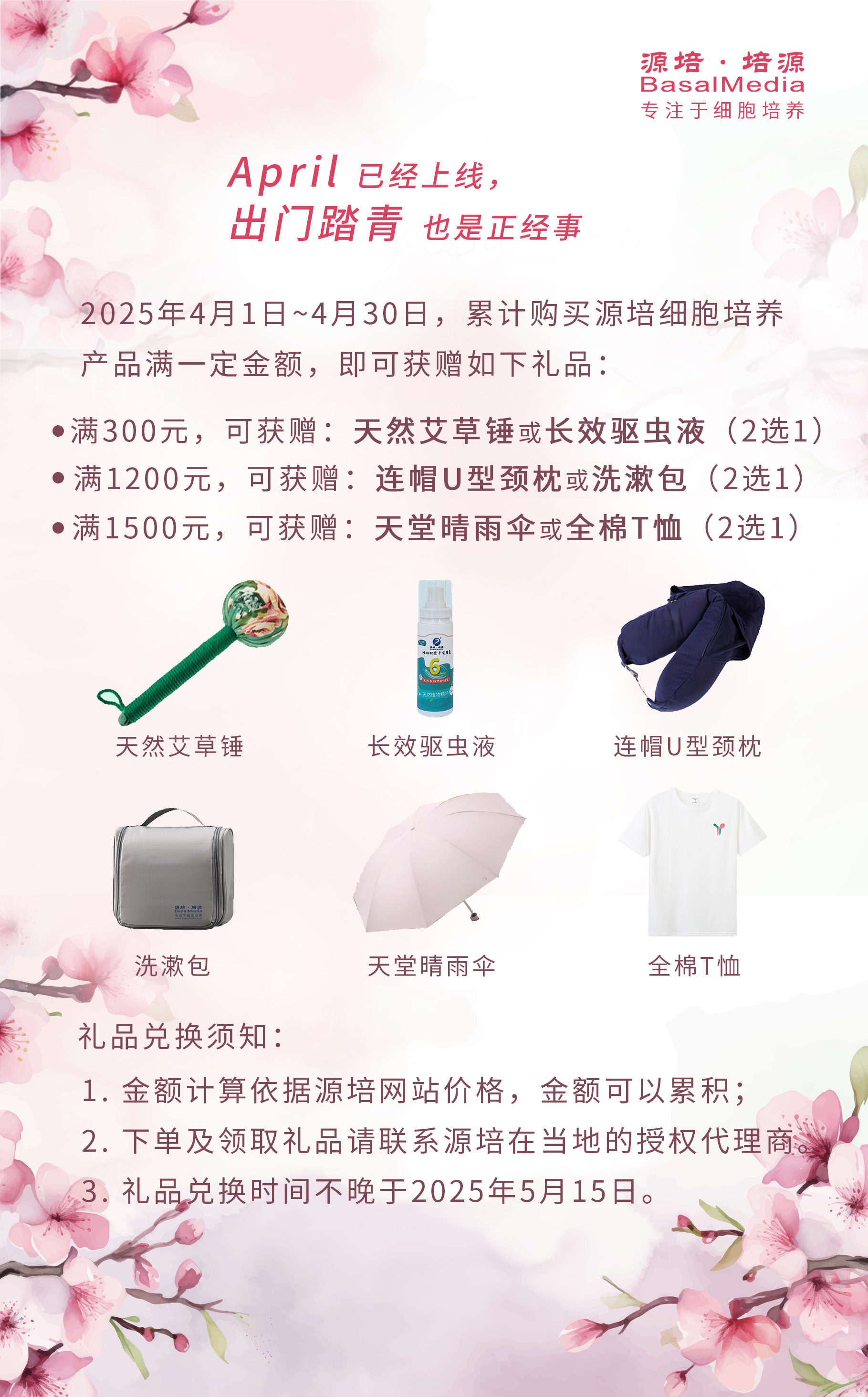 2025年4月1日—4月30日,累計(jì)購買源培細(xì)胞培養(yǎng)產(chǎn)品滿一定金額,即可獲贈(zèng)如下禮品: