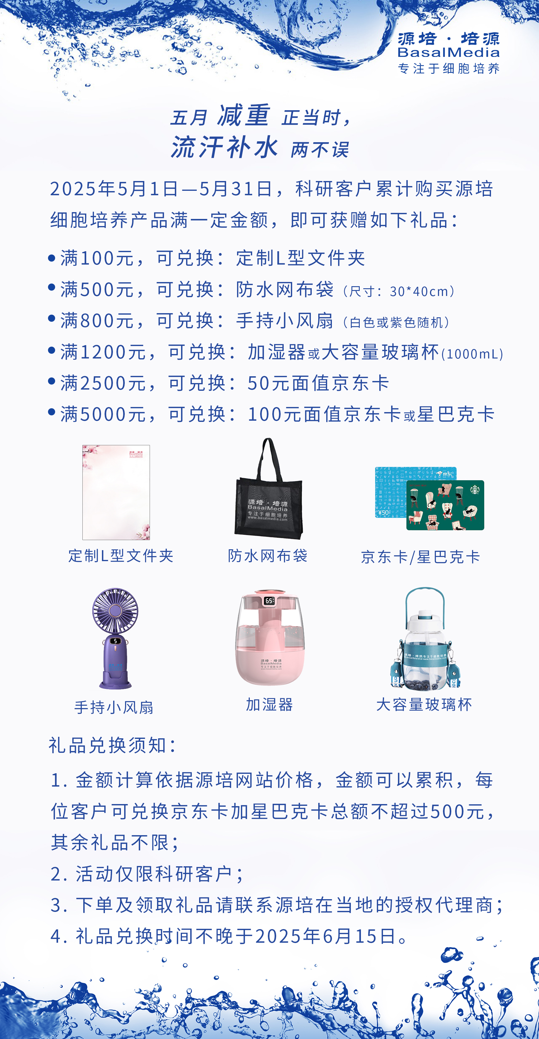 2025年5月1日—5月31日,科研客戶累計購買源培細(xì)胞培養(yǎng)產(chǎn)品滿一定金額,即可獲贈如下禮品: